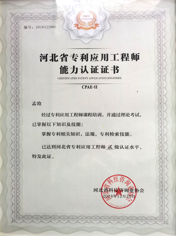 河北省專利應(yīng)用工程師能力認(rèn)證證書
